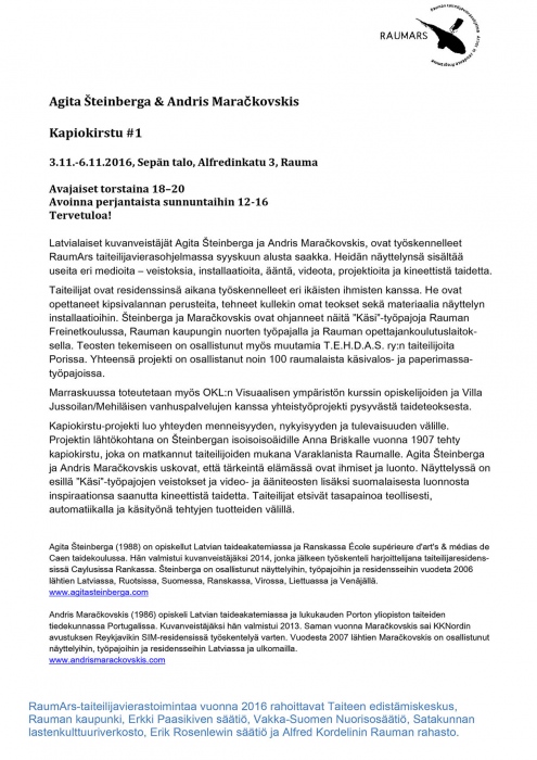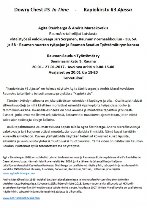 Agita Steinberga  (LV)     Andris Marackovskis (LV)   In collaboration with photographer Jari Sorjonen (FIN) IN TIME / AJASSA Sepän talo 26.11.2016 klo.  10-16 A.I.R. RaumArs